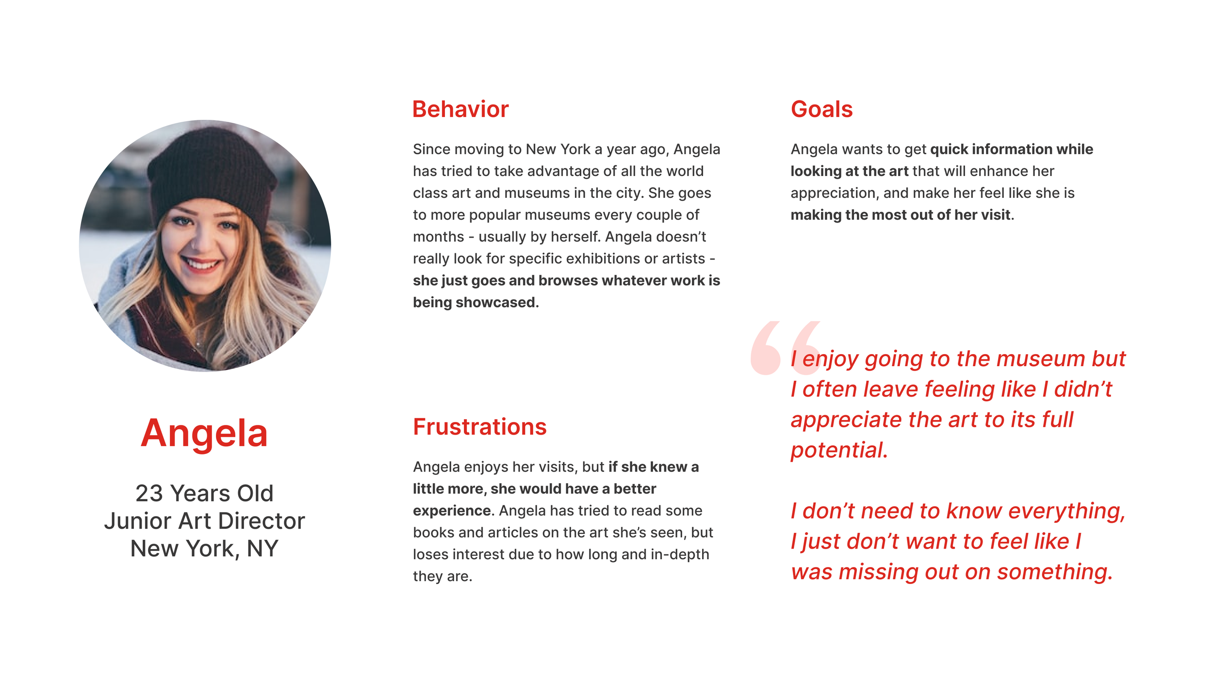 In-depth interviews based on discovering insights, pains and needs about the existing experience for regular visitors of galleries and museums
